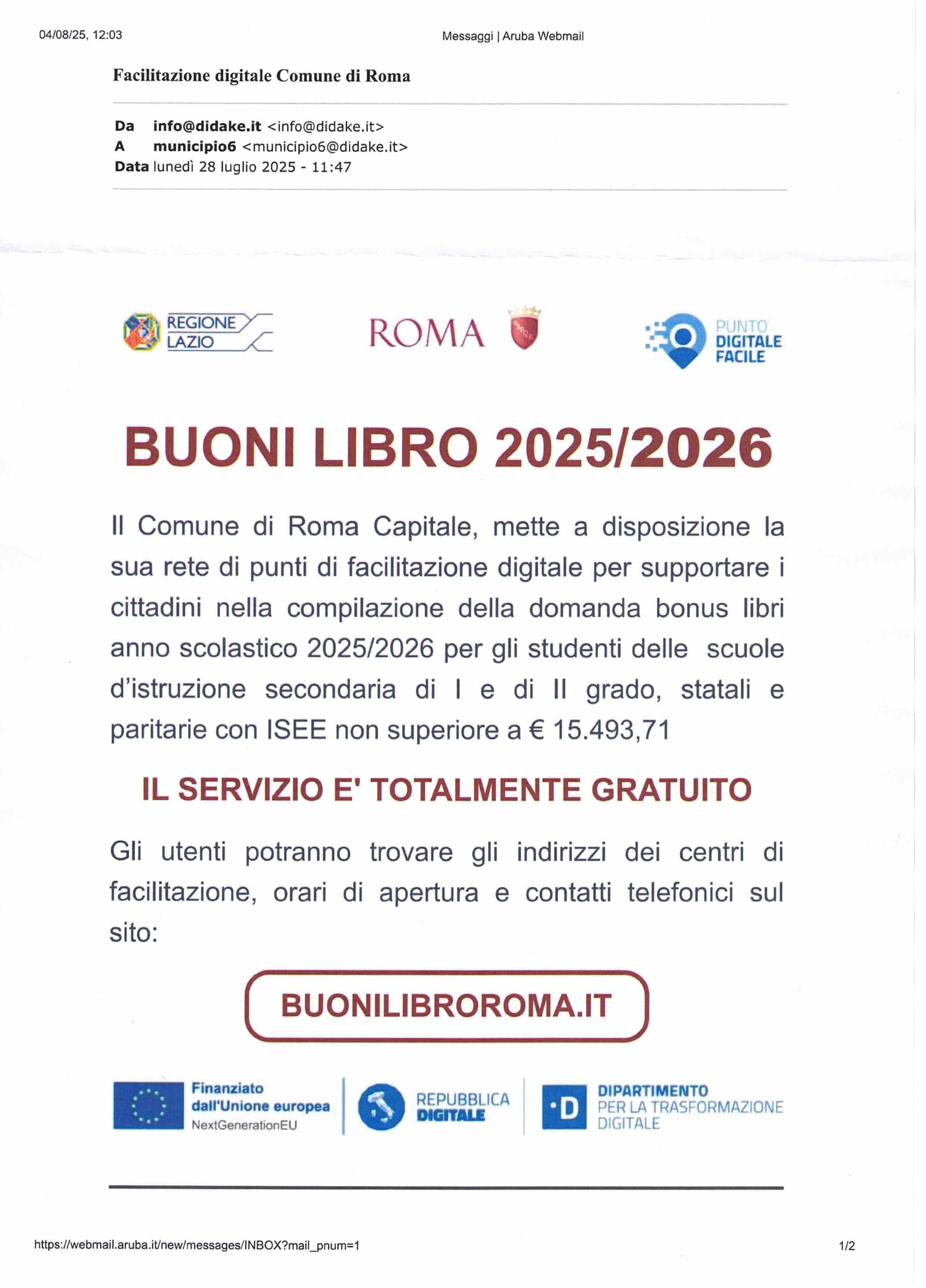 Il Comune di Roma mette a disposizione la sua rete di punti di facilitazione digitale per supportare i cittadini nella compilazione  della domanda bonus libri per l’anno scolastico 2025-2026, come descritto nella locandina allegata.